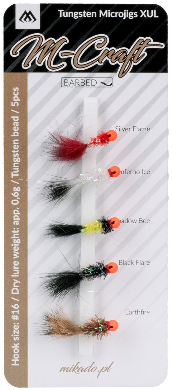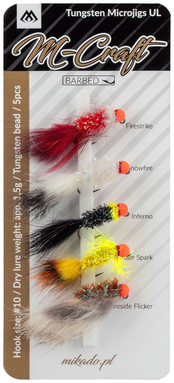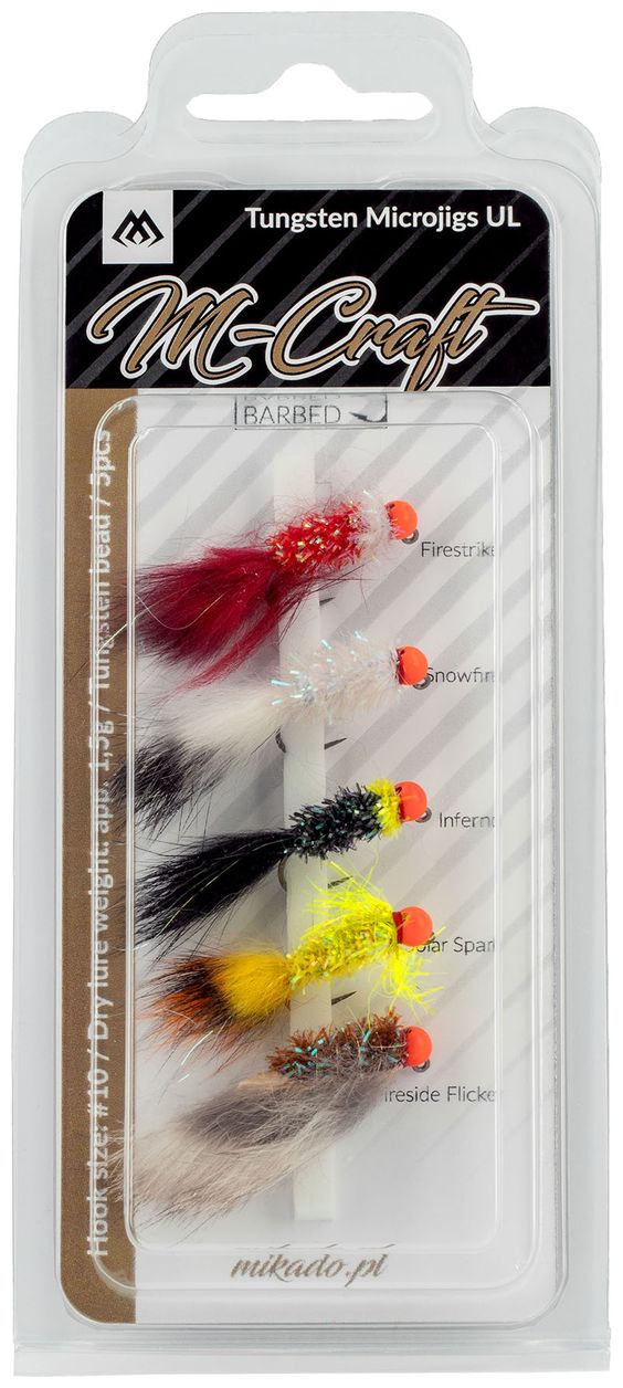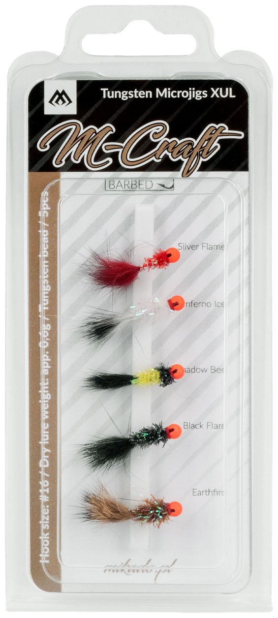 Sada Micro Jig nástrah M-Craft s wolframovými (tungsten) hlavičkami, navržena především pro lov bílé ryby a drobných dravců. Ideální použití pro plotici, ježdce, okouny, pstruhy či tloušť. Nástrahy jsou vyrobeny z kvalitních materiálů a disponují ostrými háčky s protihrotem a očkem.