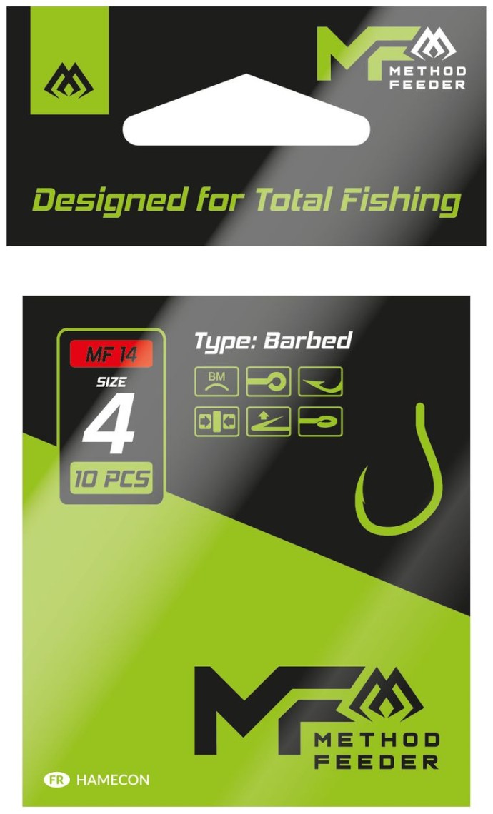 MF14 jsou nové zesílené jednoháčky (háčky s očkem) určené pro lov velkých ryb metodou method, s krmítkem (bomb) nebo pomocí pellet waggleru. Mají agresivní tvar, vysokou pevnost a spolehlivě drží rybu i při tvrdším boji.
