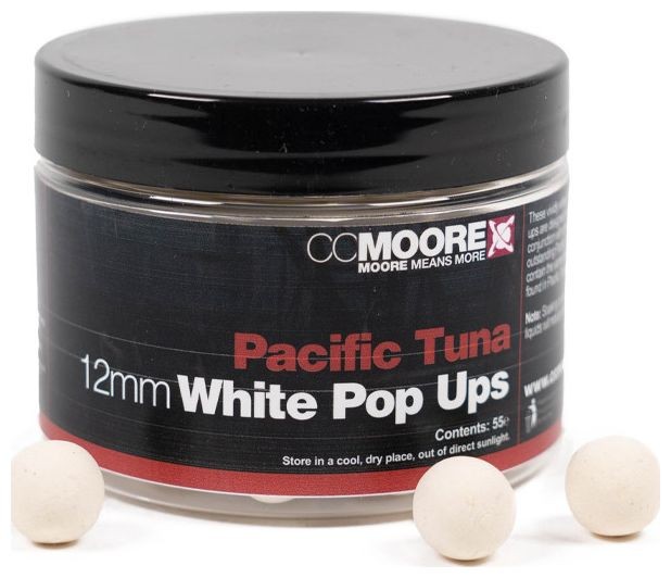 Vysoce kvalitní plovoucí pop-up boilies CC Moore Pacific Tuna - White. Velmi dobře plovoucí nástraha o průměru 12 mm, ideální pro použití samostatně nebo v kombinaci s produkty z řady Pacific Tuna.