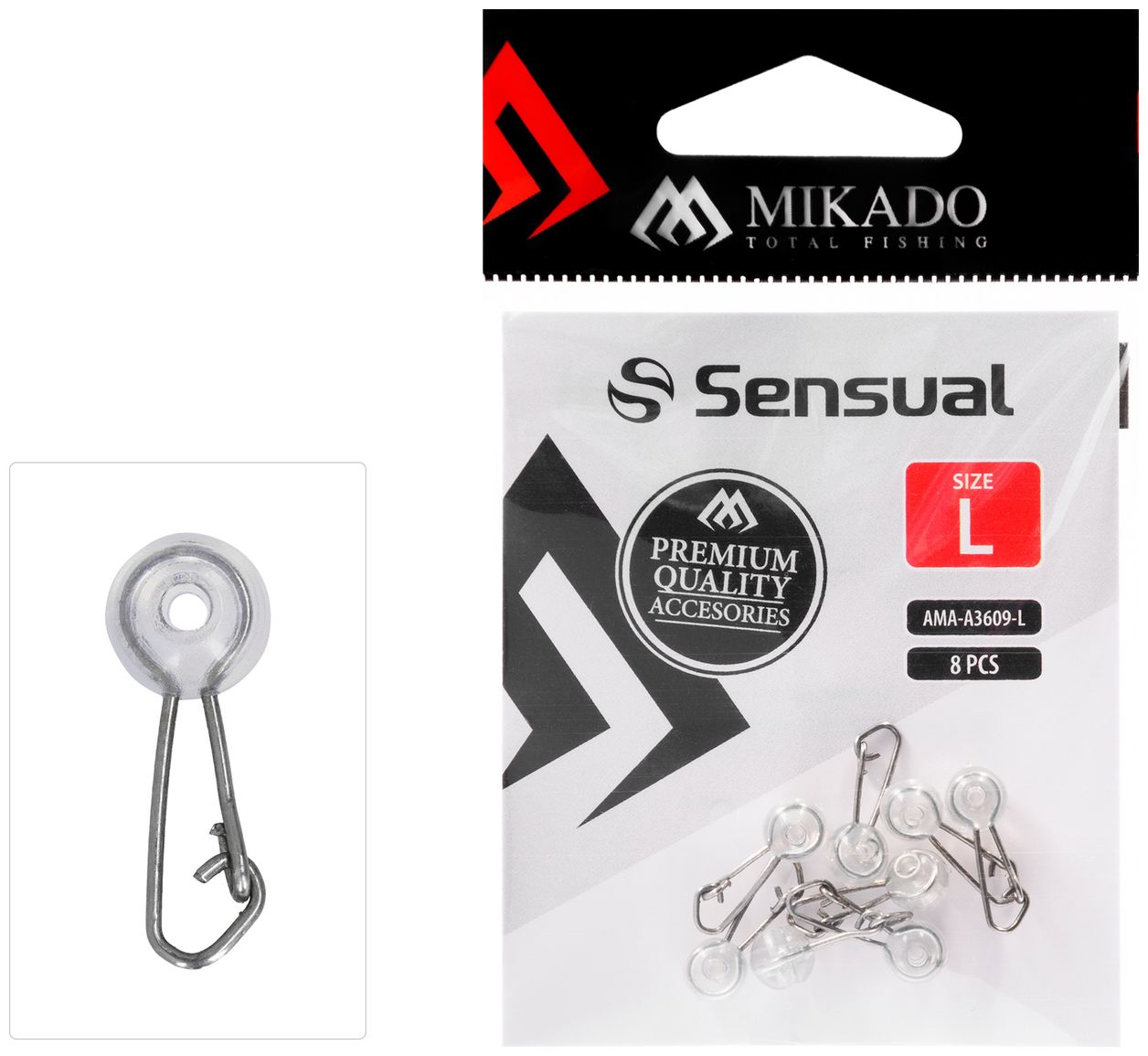 Závěska / karabinka Mikado A3609 s měkkým korálkem určená pro rychlou a bezpečnou montáž krmítek, zátěží nebo jiných komponentů montáže. Měkký korálek tlumí nárazy, snižuje riziko poškození uzlů i zamotání montáže. Díky kompaktním rozměrům lze použít také jako spojka pro průběžné splávky nebo jiné jemné aplikace, kde je potřeba pevné a hladké spojení s možností rychlé výměny.