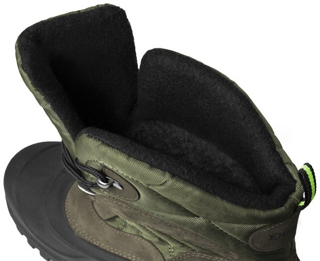 Tyto materiály dobře odolávají nepřízni počasí a jednoduše se v případě potřeby impregnují. Jazyk boty je přišitý až do výšky 17cm, to znamená, že krátkodobě se můžete pohybovat v takto hlubokých vlhkých oblastech. Šněrování je řešeno přes textilní očka, na vrchu šněrování se nachází jedno kovové oko. Vnitřek boty je tvořen příjemným mikrofleecovým materiálem. O tepelné pohodlí se postará vrstva umělého mikrovlákna mezi vnější a vnitřní vrstvou.