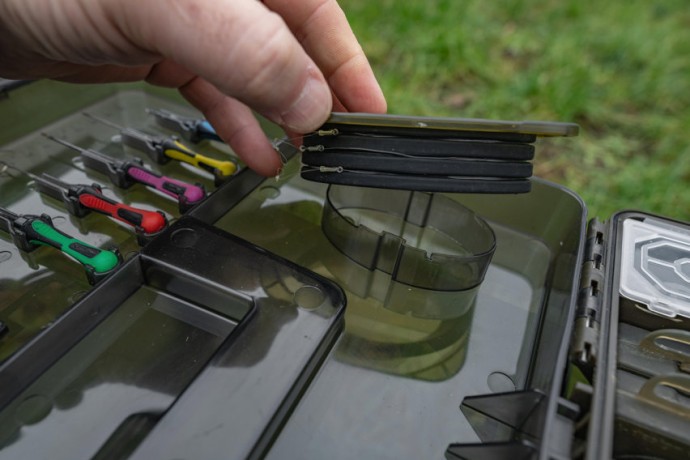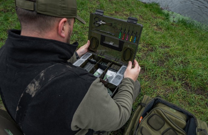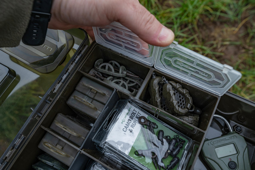 Jehly, vrtáček, vyháčkovač a nůžky se úhledně zacvaknou na své místo, zatímco hlavní box lze upravit pomocí přepážek tak, aby vyhovoval vašim potřebám. Ve víku jsou také umístěny dvě mělké schránky RIG BLOX, které uchovávají všechny vaše hotové návazce v bezpečí před povětrnostními vlivy.