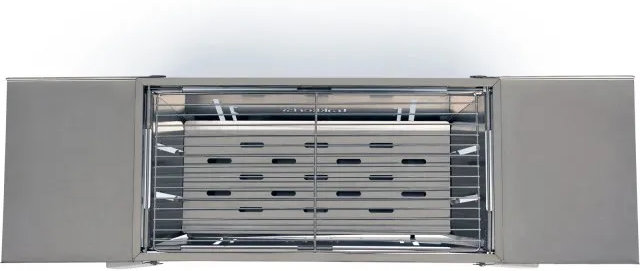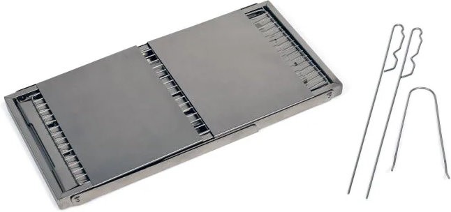 Materiál nerezová ocel, rozměry 74x22x25 cm, transport 42x22x2,5 cm, grilovací plocha 38x19 cm, hmotnost 2,7 kg, součástí taška, kolíky a rukojeť roštu pro snadné použití.