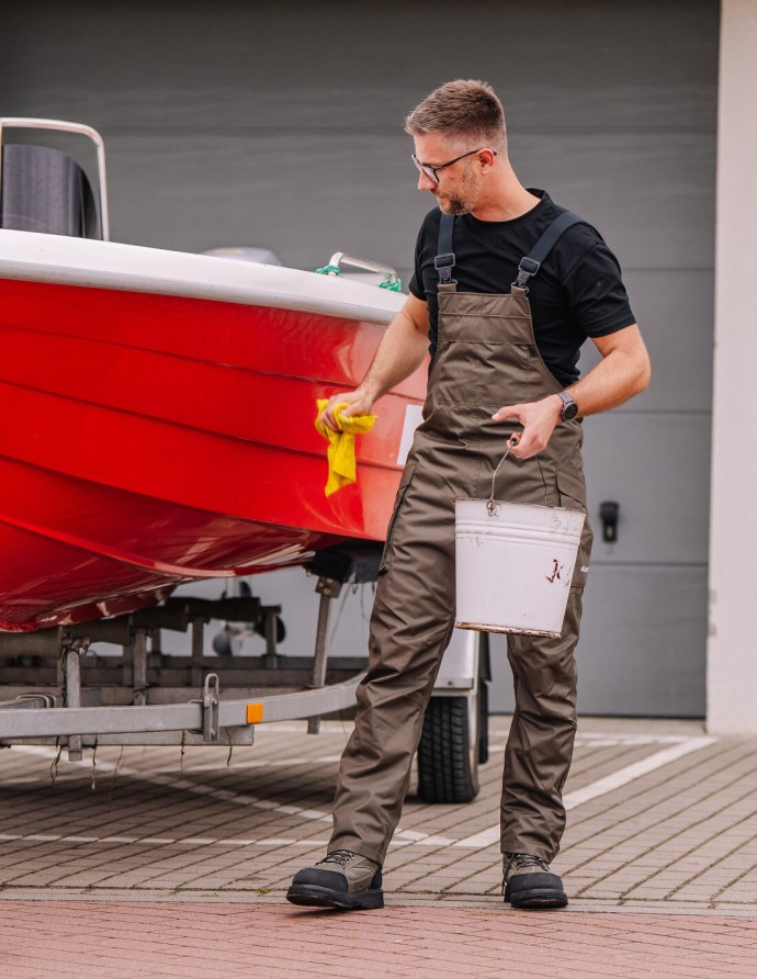 Láclové kalhoty vyznačující se voděodolností a prodyšností, vyrobené z odolné tkaniny aQuaAir. Zvýšená přední část navíc chrání břicho a hrudník. Uživatelé také ocení dvě kapsy po stranách nohavic a na hrudi, kryté klopami, nohavice odolné proti stříkající vodě se zipy a nastavitelné šle. Tento model je skvělým doplňkem k bundě modelu 285.
