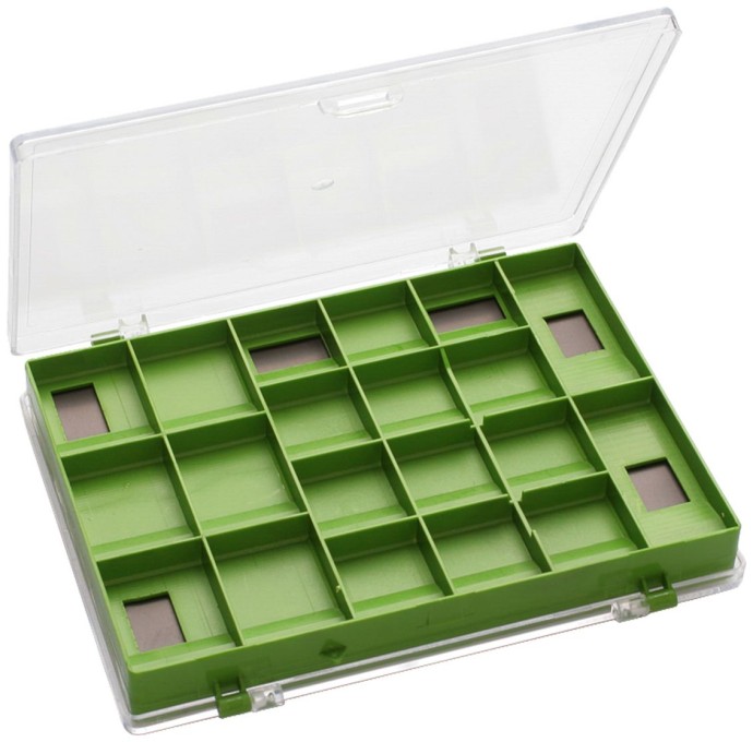 Profesionální krabička s magnetickým dnem, vyrobená především pro bezpečné a přehledné skladování háčků. Díky magnetickému dnu se háčky nepohybují volně uvnitř krabičky, zůstávají pevně na místě a nejenže jsou po ruce, ale také si udrží ostří.