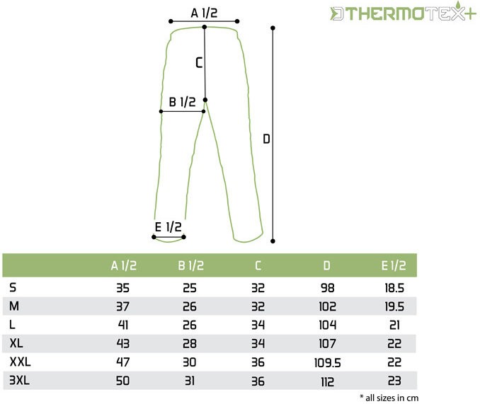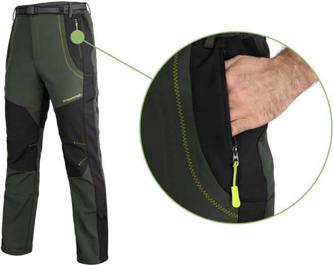 Barevně jsou kalhoty ThermoTEX Plus+ laděny do tmavé zelené a černé barvy se zářivě žlutými prvky, čímž se stanou nejen užitečnou a vysoce funkční, ale také pěknou součástí vašeho outfitu.