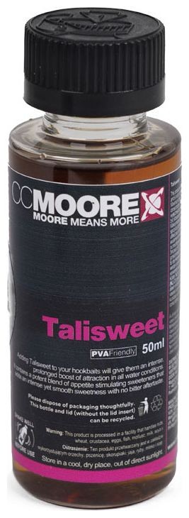 Talisweet od značky CCMoore je extrémně intenzivní tekuté sladidlo určené pro použití v háčkových nástrahách a mixech. Doporučené dávkování je až 1 ml na vejce nebo jako namáčení háčkových nástrah, přičemž zároveň pomáhá zpevnit nástrahy. Produkt je velmi hladký a nezanechává nepříjemnou hořkou pachuť.