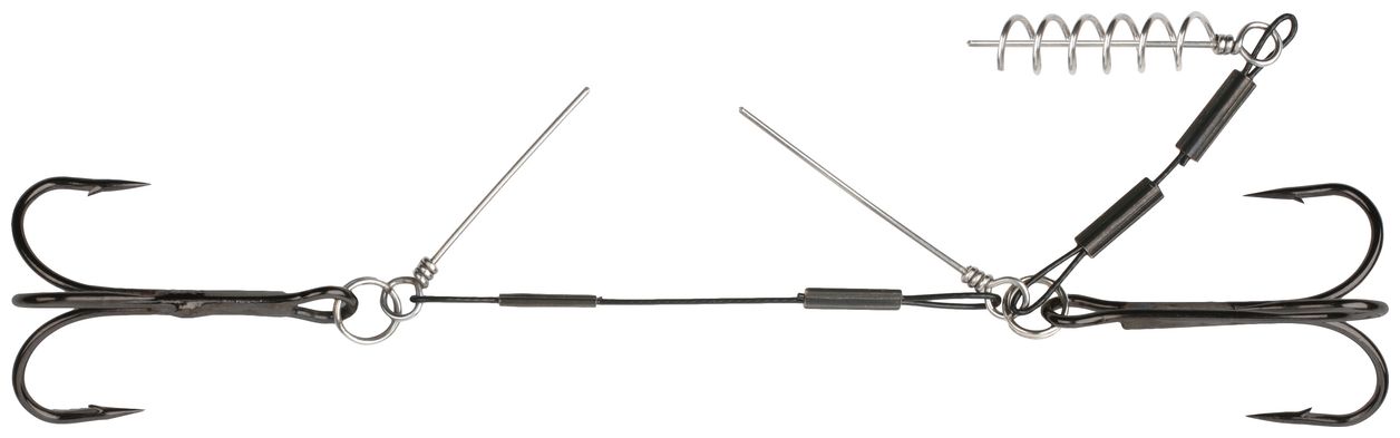 Při záběru piny snadno vyklouznou a trojháčky společně s pevnou ocelovou šňůrkou bezpečně udrží úlovek. Díky konstrukci je systém vhodný pro masivnější gumové nástrahy, kde je potřeba vyšší nosnost a spolehlivost.