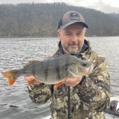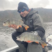 Já jsem se pustil do rybolovu s (pro většinu rybářů úplně šílenou nástrahou) pěnovou mandulou značky Prof Montazh. Tyto nástrahy v jejich dvou nejmenších velikostech vznikli na východě konkrétně pro lov okounů a volžských candátů, takže jsem předpokládal že by měli fungovat i u nás. A bylo tomu tak. Právě s touto nástrahou jsem toho rána ulovil mimo mnoha menších i své největší okouny o délkách 35 a 36 cm. I přesto, že se jednalo o první opravdu mrazivé dopoledne letošního roku, jsme tu zimu snad ani nevnímali, protože na to zkrátka nebyl vůbec čas. Tahali jsme, dá se říci, okouna za okounem v průběhu celého dopoledne.
