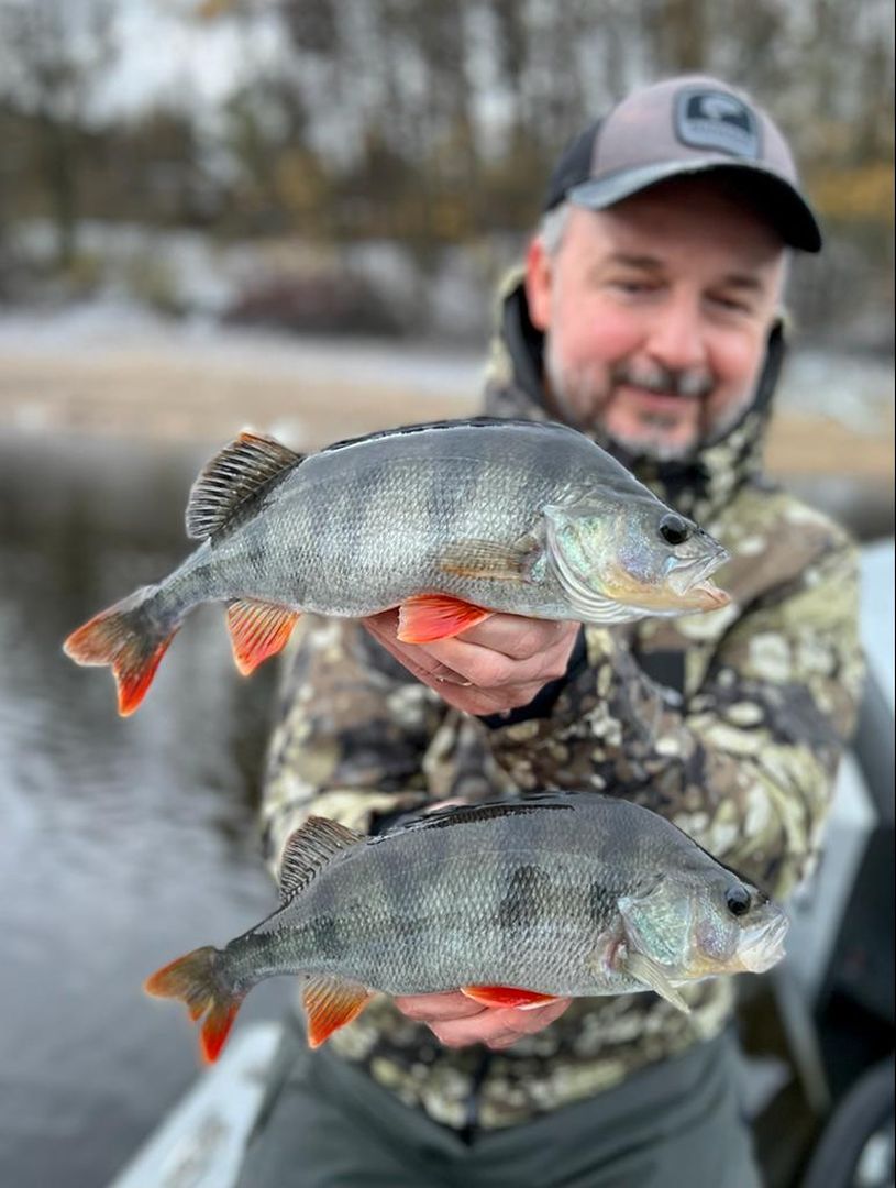 Já jsem se pustil do rybolovu s (pro většinu rybářů úplně šílenou nástrahou) pěnovou mandulou značky Prof Montazh. Tyto nástrahy v jejich dvou nejmenších velikostech vznikli na východě konkrétně pro lov okounů a volžských candátů, takže jsem předpokládal že by měli fungovat i u nás. A bylo tomu tak. Právě s touto nástrahou jsem toho rána ulovil mimo mnoha menších i své největší okouny o délkách 35 a 36 cm. I přesto, že se jednalo o první opravdu mrazivé dopoledne letošního roku, jsme tu zimu snad ani nevnímali, protože na to zkrátka nebyl vůbec čas. Tahali jsme, dá se říci, okouna za okounem v průběhu celého dopoledne.